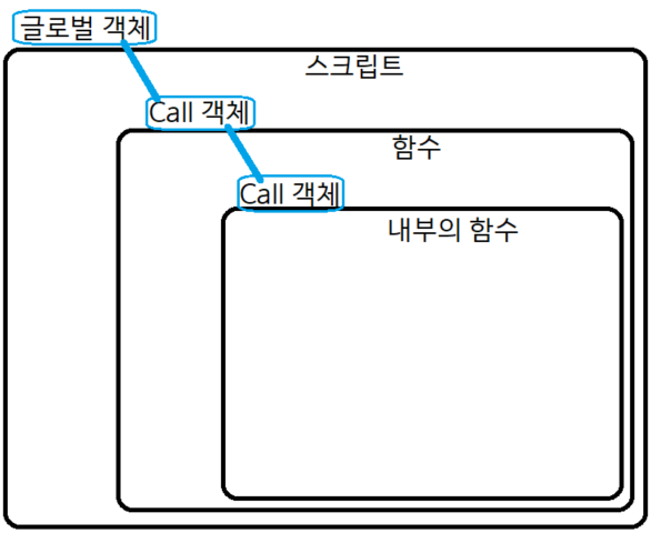 마찬가지로 로컬 변수 또한 글로벌 객체와 유사한 객체로 관리됩니다. 이를 Call 객체(Activation 객체)라고 부르는데, Call 객체는 Global 객체처럼 인스턴스화나 메소드 호출이 불가능하며, 함수가 호출 될 때마다 로컬 변수들을 관리하기 위한 자동 생성 객체입니다.