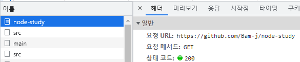 혹은 개발자 도구의 네트워크에서 정보를 확인할수도 있습니다. 제 노드 공부용 리포지토리에 접속한 순간인데 리포지토리 페이지 정보를 GET메소드로 받아와서 표시했다고 알아볼 수 있게 됩니다.